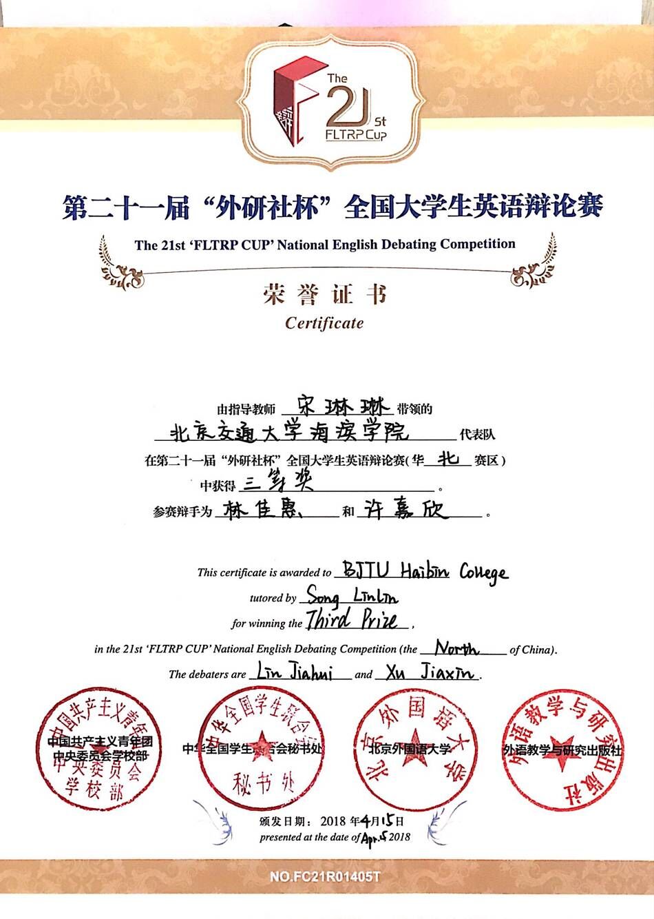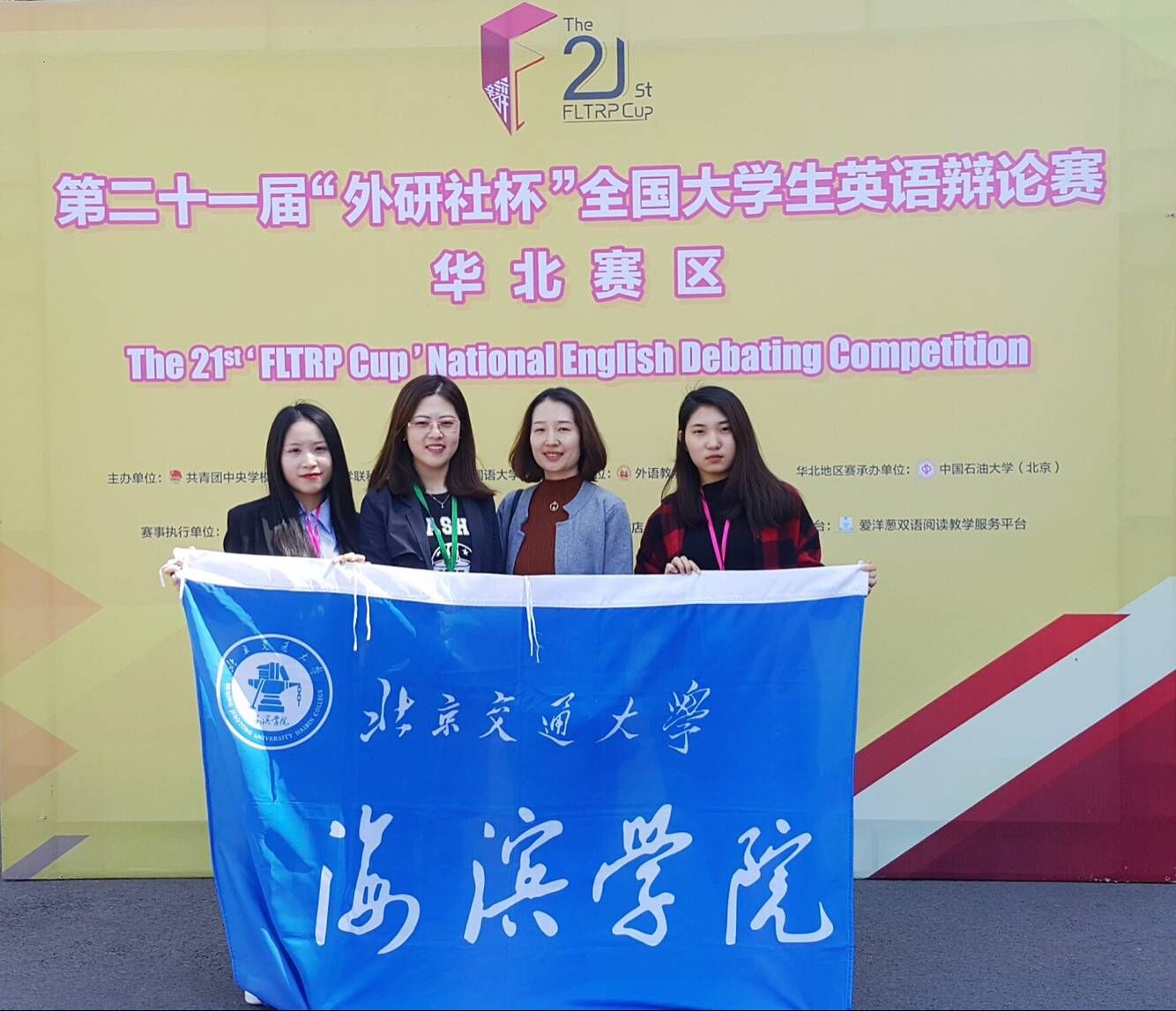 4月13日到15日,第二十一届“外研社杯”全国大学生英语辩论赛华北赛区总决赛在中国石油大学(北京)落下帷幕,来自北京、天津、河北、辽宁、吉林、黑龙江的87所院校174名选手参赛。经过初赛筛选,我校由外语系宋琳琳,贾世娇老师带队,外语系15级学生许嘉欣,16级学生林佳惠代表我校参加比赛。